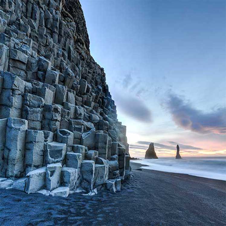 Approximately 180 km southeast of Reykjavik is Reynisfjara, a black sand beach, surrounded by roaring surf, and the hexagonal basalt columns of Reynisfjall mountain.